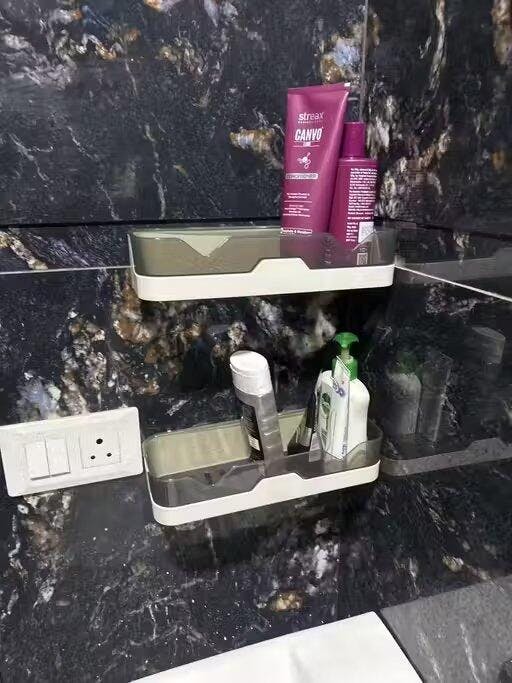 Luxury Finish Look – Sleek tinted guard with glossy ABS plastic adds a touch of elegance to your bathroom.Hotel-Style Storage – Brings a 5-star hotel vibe to home bathrooms.Ultra-Strong Adhesive Tech – Uses advanced nano-adhesive for maximum stability & durability.Moisture-Resistant Design – Stays strong even in steamy showers and humid conditions.Versatile Utility – Perfect for holding premium skincare, perfumes, shaving kits, or even indoor plants.
